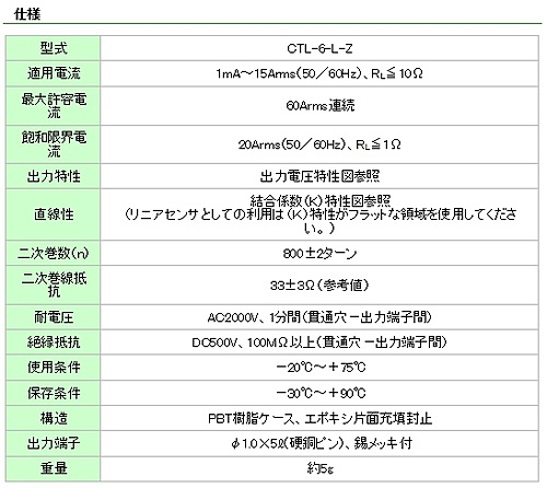 〔特 長〕・プリント板水平取付用ストレートピン。精密計測用CTL-Zシリーズの最小型機種。・超小型品ながら貫通穴は(φ6)を確保。重量約5gで、貫通導体と一体でプリント板に直接搭載する組立法に最適です。・高透磁率パーマロイコアの採用で、1mA ~ 15Aのワイドレンジをカバー。・800:1の高変流比で直接電子回路へのインターフェースが可能。