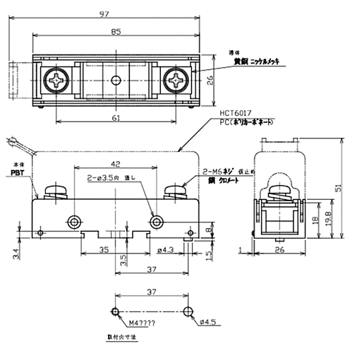 ●定格電圧:700V ●定格電流:75A ●適合電線:最大22mm²(M6) ●取り付け:DINレールおよび直付け ●材質:PBT ●ヒューズホルダは連続通電75Aまで ●速断ヒューズ660GH/750GH用
