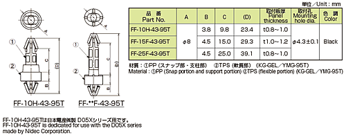 冷却ファンからの振動伝達を減衰することにより、共振やビビリ音などの発生を抑えます。 スナップ構造によりワンタッチ取付が可能で、ネジ・工具が不要になります。 【材質】 ①PP(スナップ部・支柱部) ②TPS(軟質部) (KG-GEL/YMG95T) ※写真はイメージです。 ※RoHS対応状況:製品ごとに異なりますのでメーカーホームページより御確認ください。