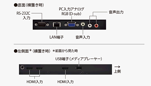 制御用のRS-232C端子とLAN端子を搭載。別売のコンテンツ配信・表示システム e-Signage Sを利用することで、遠隔地からのPC制御も可能です。