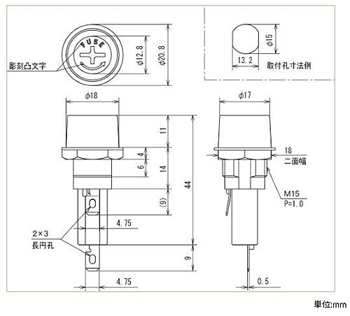 ■定格:250V-10A ■絶縁抵抗:DC500V、100MΩ以上 ■耐電圧:AC2000V(1分間) ■取得規格:UL規格・CSA規格 ■主絶縁材(本体):フェノール(UL94V-0) ■主絶縁材(ツマミ):P.B.T.(UL94V-0) ■端子金具:はんだ付け兼用187タブ端子(t0.5) ■本体色:B(黒) ■取付板厚:5mm(MAX) ■ナット締付けトルク:1.2N・m以下 ■キャップ締付けトルク:0.4N・m以下(推奨工具プラスまたはマイナスドライバー) ■ナット二面幅:18mm ■使用上の注意: ①規格品としてご使用の場合は、規格上の制約等をご確認ください。 ※写真はイメージです。 ※在庫切れの場合は別途御相談させて頂きます。