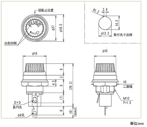 ■定格:250V-5A■絶縁抵抗:DC500V、100MΩ以上■耐電圧:AC2000V(1分間)■主絶縁材(本体):フェノール(UL94V-0)■主絶縁材(ツマミ):P.B.T.(UL94V-0)■端子金具:はんだ付け用端子■本体色:B(黒)■取付板厚:3.5mm(MAX)■ナット締付けトルク:0.7N・m以下■ナット二面幅:16mm■使用上の注意:①底部端子は可動式のため、束線等により端子の動きを妨げないようにしてください。また、配線後、端子にリード線の張力等が加わらないように周囲の配線等にご注意ください。※写真はイメージです。※在庫切れの場合は別途御相談させて頂きます。