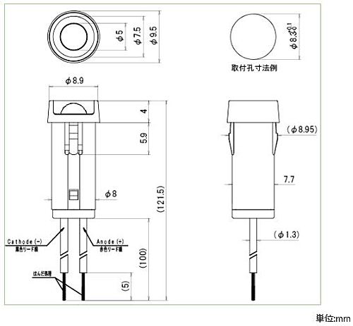 ①本製品には保護抵抗は内蔵されておりませんので、使用電圧に合わせた保護抵抗を直列に接続してご使用ください。②接続の際は極性にご注意ください。③取付板厚によって取付孔寸法が異なる場合もありますのでご確認ください。