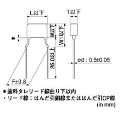 【スペック】 ●L寸法 or 外径寸法D 4.0mm 以下 ●W寸法 3.5mm 以下 ●T寸法 2.5mm 以下 ●リード間隔F 5.0±0.8mm ●リード線径d 0.5±0.05mm ●静電容量 0.10μF ±10% ●定格電圧 50Vdc ●温度特性 (準拠規格) X7R(EIA) ●静電容量変化率 ±15% ●温度特性の温度範囲 -55℃ ~ 125℃ ●使用温度範囲 -55℃ ~ 125℃ ●W1寸法 6.0mm ●鉛フリー品(鉛の含有が1000ppm未満)、ハロゲンフリー品 ※写真はイメージです。 ※在庫切れの場合は別途御相談させて頂きます。