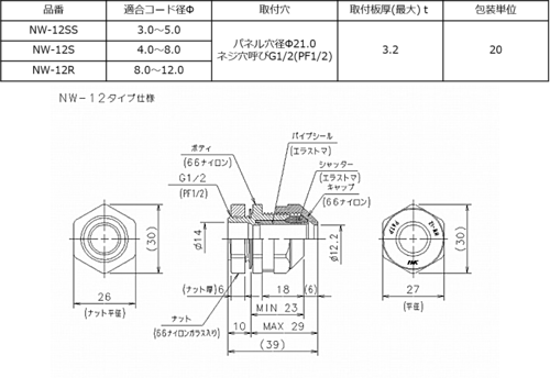ケーブルグランド 優れた耐衝撃性、耐熱性、電気絶縁性及び耐薬品性(塗装仕様にも最適) 用途によって使い分けられる14タイプ 各種の太さのコードを水、油等から完全に遮断 優れた密封性、締付力 機器の高密度実装に最適