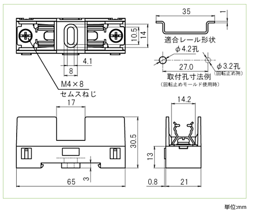 1Pのヒューズホルダー(ネジ締付端子) 連結して増極可能です。 UL、C-UL規格認証品(規格品として、F-720-FCL以外の F-720用オプションと、F-1000-S1が装着可能です) 仕様 ・定格 250V-20A ・絶縁抵抗 DC500V、100MΩ以上 ・耐電圧 AC2000V (1分間) ・取得規格 UL規格・C-UL規格 ・絶縁材 (本体) PBT (UL94V-0) ・本体色 W (白) ・端子金具 ねじ締付端子 (M4×8 セムスねじ) ・端子ねじ締付けトルク 1.2N ・m ・取付ねじ締付けトルク 1.0N ・m : M4ねじ、平ワッシャー使用時 ・適合レール(DINレール) トップハット形 幅35mm 使用上の注意 ・F-720-FCLを装着した場合はUL、C-UL規格認証品とはなりません。 (F-720-FC1、F-720-FC2はUL、C-ULで使用を認められています) ・規格品としてご使用の場合は、規格上の制約等をご確認ください。 ※写真はイメージです。 ※在庫切れの場合は別途御相談させて頂きます。