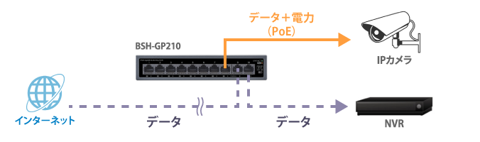PoE給電に対応していない既存のネットワーク環境にPOE環境を追加電源確保が困難な環境へネットワーク機器を新たに設置する際に利用遠距離モードでIPカメラの離れた場所への設置に利用「遠距離/10Mbps」 IPカメラモードを有効にすると、通信速度が10Mbpsに制限されます。※本商品は、室内利用に限ります。