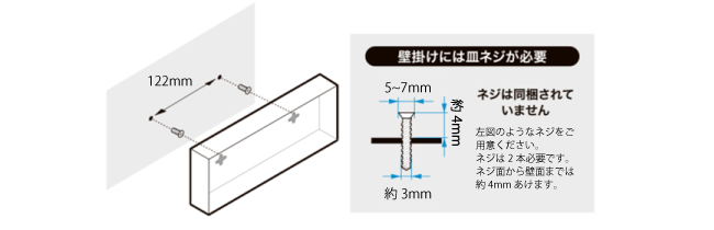 壁掛け用フックホールが商品背面にあり、壁面にネジを取り付けることで壁面へ設置ができます。※ 壁面取り付けネジは添付しておりません。下の図を参考に別途ご用意ください。