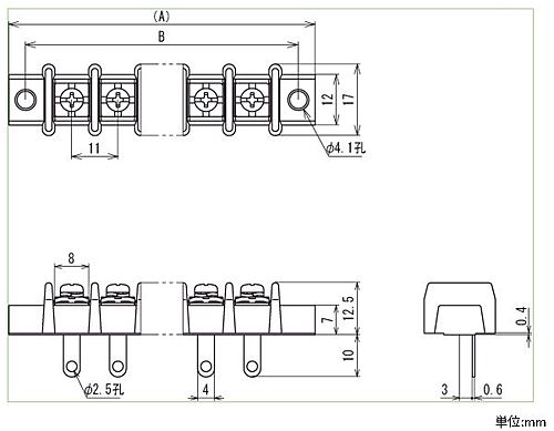 ■定格:250V-10A■絶縁抵抗:DC500V、100MΩ以上■耐電圧:AC2000V(1分間)■取得規格:UL規格■極数(P):4■主絶縁材:フェノール(UL94V-0)■端子ネジ:角座金付ネジ(M3×8)、端子ネジ締付トルク 0.5N・m MAX■端子金具:はんだ付け用端子■本体色:B(黒)■取付方式:ネジ止め■使用上の注意:①切断加工により製作されるため、若干の跡、段がつきます。②規格品としてご使用の場合は、規格上の制約等をご確認ください。③電線を接続せずに端子ネジを締めつける場合は、0.2~0.3N・mのトルクで締めつけてください。④ネジ締めにインパクトドライバーを使用するとネジ部破損の恐れがありますので使用しないでください。⑤電線接続の際は強く締めすぎるとネジ部破損の恐れがありますので、締め付けトルクを守ってください。